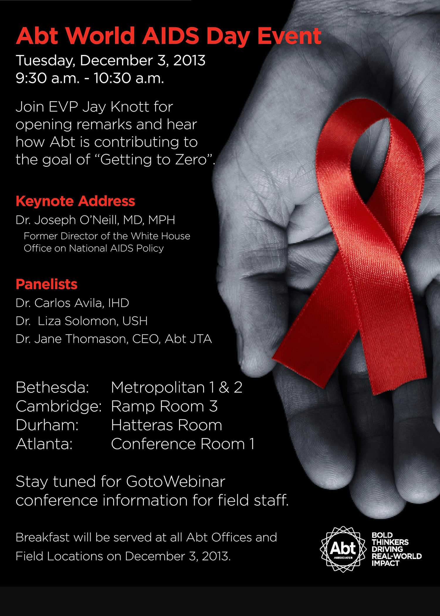 Next Tuesday, December 3rd, please join your colleagues around the world as we observe World AIDS Day 2013. We are pleased to have Dr. Joseph O’Neill, former Director of the White House Office of National AIDS Policy, join us as our keynote speaker. Abt discussants are: Dr. Carlos Avila, Dr. Liza Solomon, and Dr. Jane Thomason, CEO, Abt JTA.