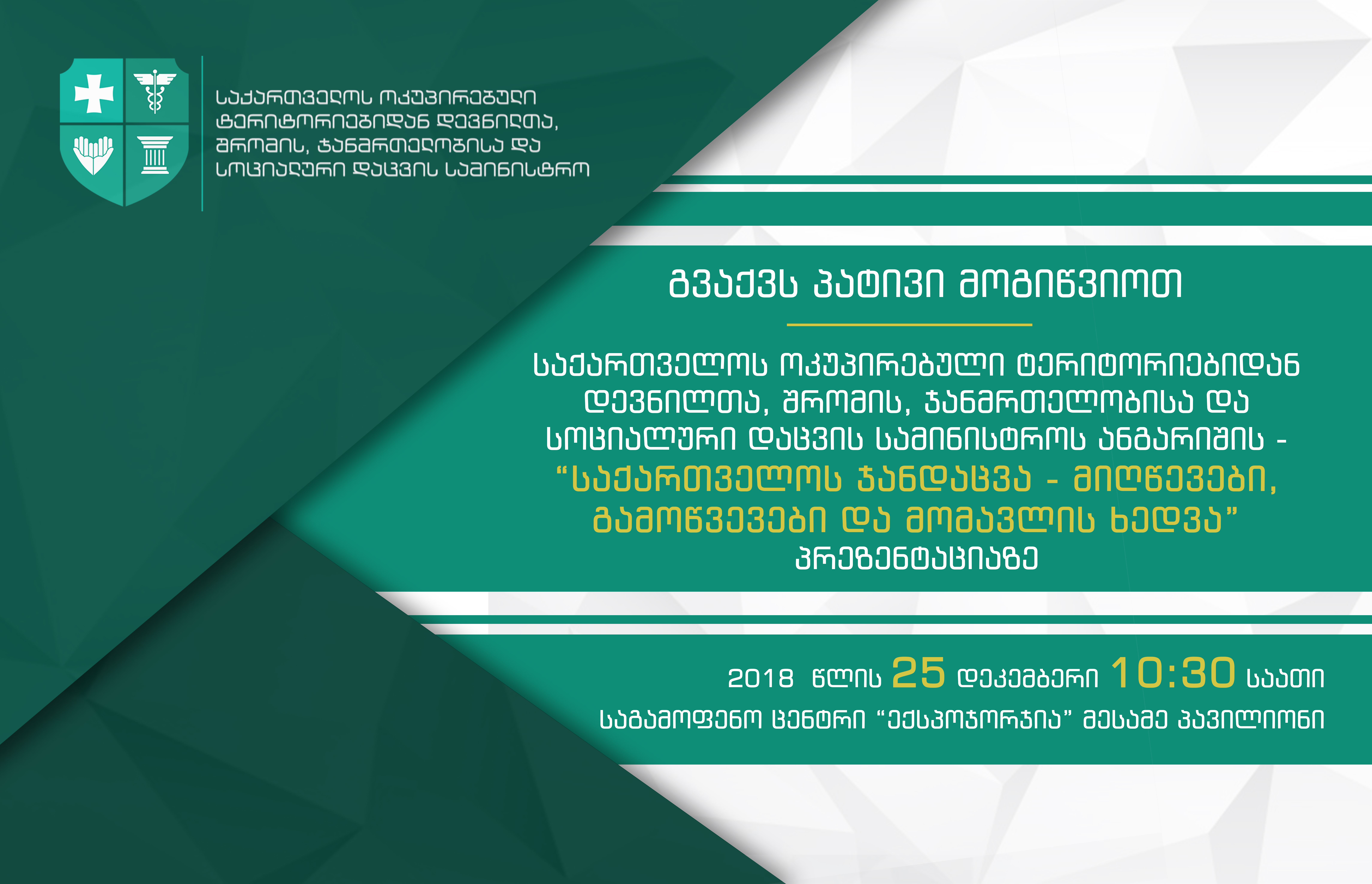 გაცნობებთ, რომ ამა წლის 25 დეკემბერს 10:30 საათზე საგამოფენო ცენტრ "ექსპოჯორჯიას" III პავილიონში საქართველოს ოკუპირებული ტერიტორიებიდან დევნილთა, შრომის, ჯანმრთელობისა და სოციალური დაცვის მინისტრი დავით სერგეენკო გამართავს სამინისტროს ანგარიშის „საქართველოს ჯანდაცვა - მიღწევები, გამოწვევები და მომავლის ხედვა“ პრეზენტაციას, რომელსაც ესწრებიან მინისტრთა კაბინეტის წევრები პრემიერ-მინისტრის ხელნძღვანელობით, პარლამენტის თავმჯდომარე, უმრავლესობის ლიდერი, სამედიცინო სფეროს წარმომადგენლები.