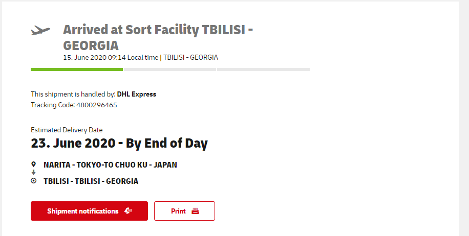 Shipment paperwork has now reached Tbilisi and customs procedure is initiated. Please make sure to contact DHL Express as soon as possible, so the customs procedure does not delay the shipment.