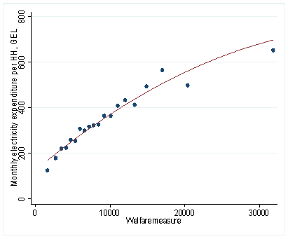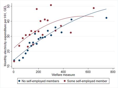 Fig 1. The correlation between residential electricity expenditure and welfare is positive but weak, it is even weaker for households where at least one member is self-employed