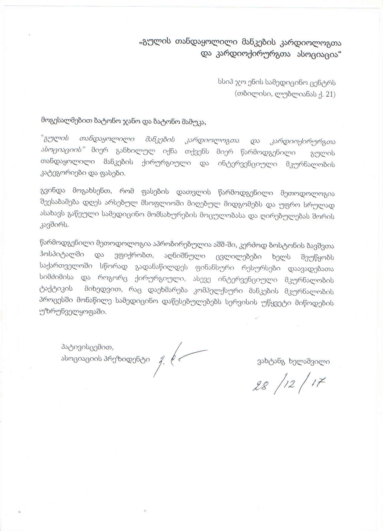 ამ წერილზე მიბმული ფაილების სახით გთავაზობთ დადებით პასუხებს თანდაყოლილი მანკების ქირურგიული და ინტერვენციულ-კარდიოლოგიური მკურნალობის ახალი მოდელის შესახებ, რომელიც დაფუძნებულია ამ დარგში მსოფლიოს წამყვანი კლინიკის - ბოსტონის ბავშვთა ჰოსპიტალის მიერ შემოთავაზებულ მეთოდოლოგიაზე და სრულიად ადაპტირებულია საქართველოს ჯანდაცვის სისტემასთან.