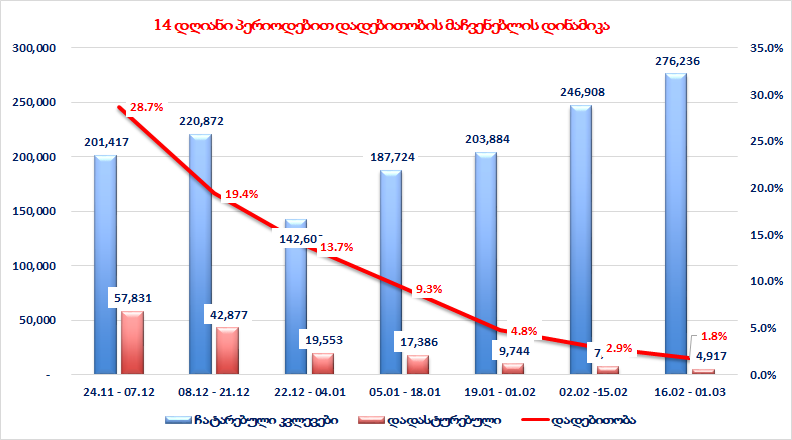 19 იანვარი - 1 თებერვალი განმავლობაში საშუალოდ დღეში აღებული იქნა 14.563 საკვლევი ნიმუში,