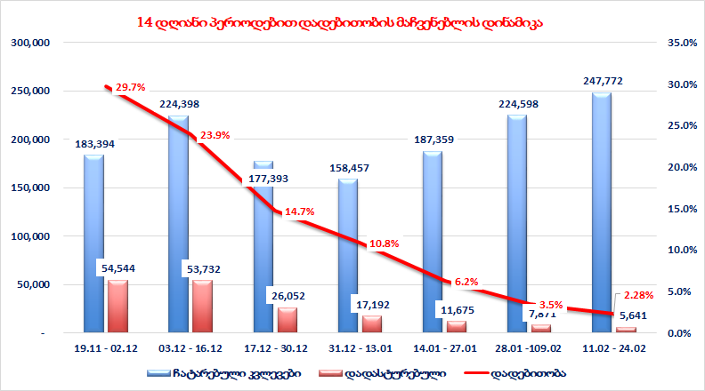 28 იანვარი - 10 თებერვალი 16.043 ნიმუში, 11 - 24 თებერვალი 17.698 ნიმუში.