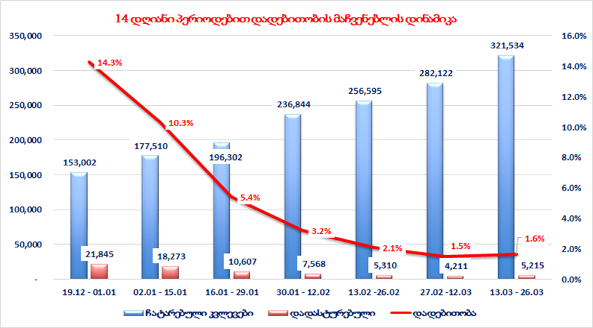 13-26 თებერვალი განმავლობაში საშუალოდ დღეში აღებული იქნა 18.328 საკვლევი ნიმუში, 27 თებერვალი - 12 მარტი 20.152 ნიმუში,  13-26 მარტი 22.967 ნიმუში. (საშუალოდ დღეში ბოლო ერთი თვის მანძილზე 22.134 PCR და Antigen ნიმუშები)