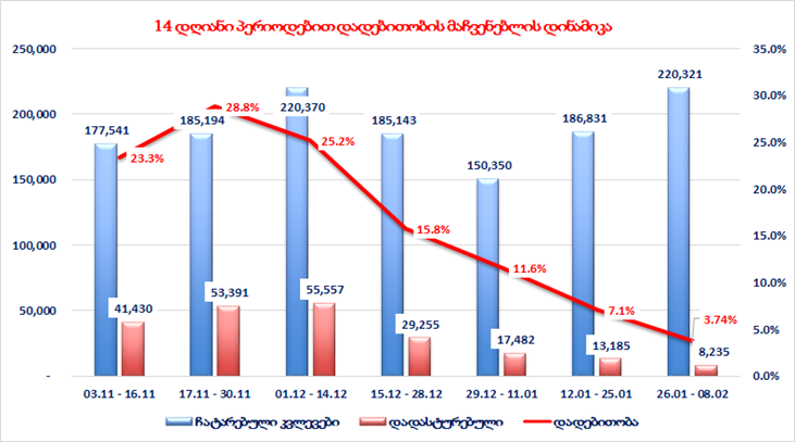 29 დეკემბერი-11 იანვრის განმავლობაში საშუალოდ დღეში აღებული იქნა 10.920 საკვლევი ნიმუში,  12-25 იანვარი  13.311 ნიმუში,  26 იანვარი - 8 თებერვალი 15.566 ნიმუში. (საშუალოდ დღეში ბოლო ერთი თვის მანძილზე 14.438 PCR და Antigen ნიმუშები)