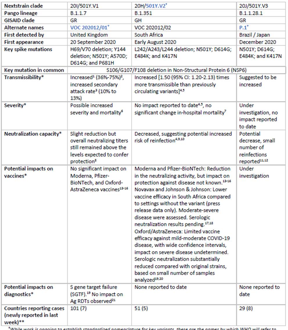 • Emerging Variant B.1.525 was detected in the United Kingdom and Nigeria in December 2020. Since then, it has been detected in at least another 13 countries. This variant is partially similar to the 501Y.V2 variant and contains mutations which may be associated with some degree of biological significance, including the E484K, Q677H and F888L mutations, as well as a similar number of deletions that are contained in B.1.1.7.E484K has been labelled as an escape mutation, so called because it may help the SARS-CoV-2 virus to evade host immune defenses.