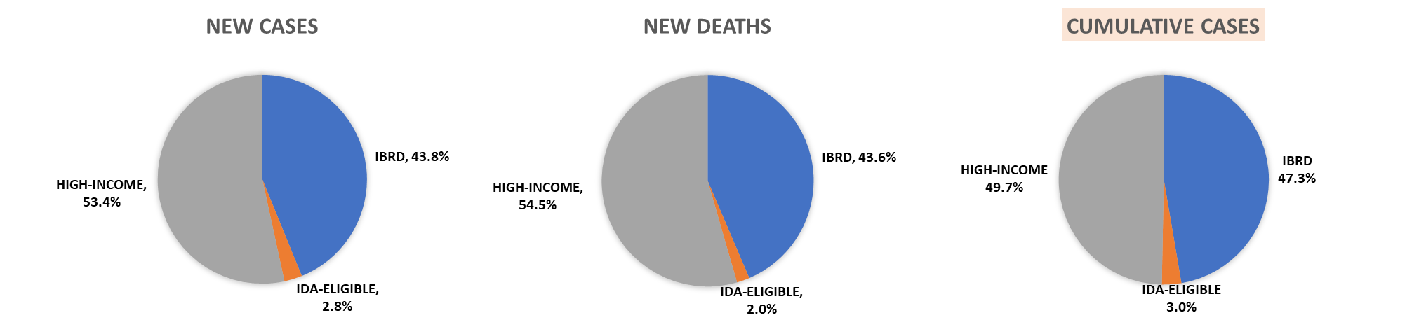 Of the total COVID-19 cases: 47.3% were reported in IBRD countries, 3.0% were reported in IDA-eligible countries, and 49.7% in High-income countries.
