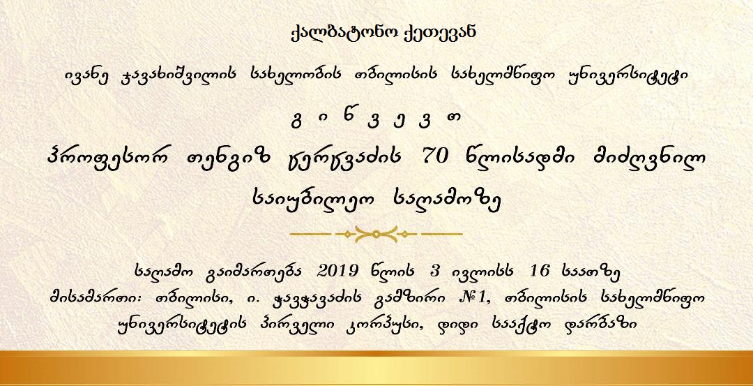 ა.წ. 3 ივლისს (ოთხშაბათს), დღის 4 საათზე, ივანე ჯავახიშვილის სახ. თბილისის სახელმწიფო უნივერსიტეტის I კორპუსის სააქტო დარბაზში გაიმართება პროფესორ თენგიზ ცერცვაძის საიუბილეო საღამო.