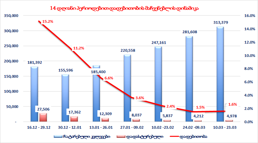 დღიურად ჩატარებული ტესტების რაოდენობა : PCR – 9542 და ანტიგენი - 13751 სულ -