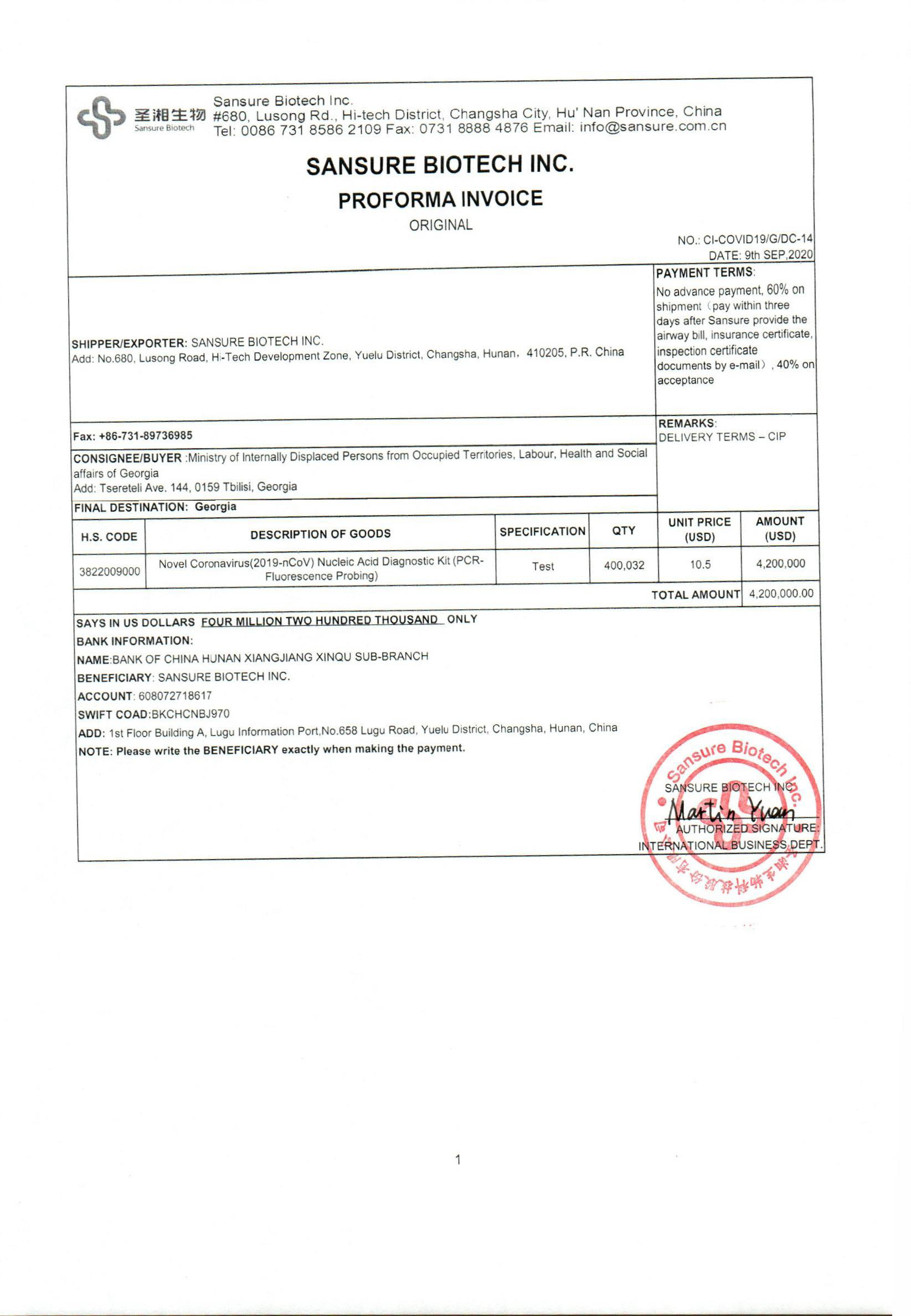 As I have already informed, the Ministry of Health of Georgia is going to purchase Coronavirus(2019-nCoV) Nucleic Acid Diagnostic Kits manufactured by Sansure Biotech, Inc. within the World Bank Emergency COVID-19 Response Project #P173911.