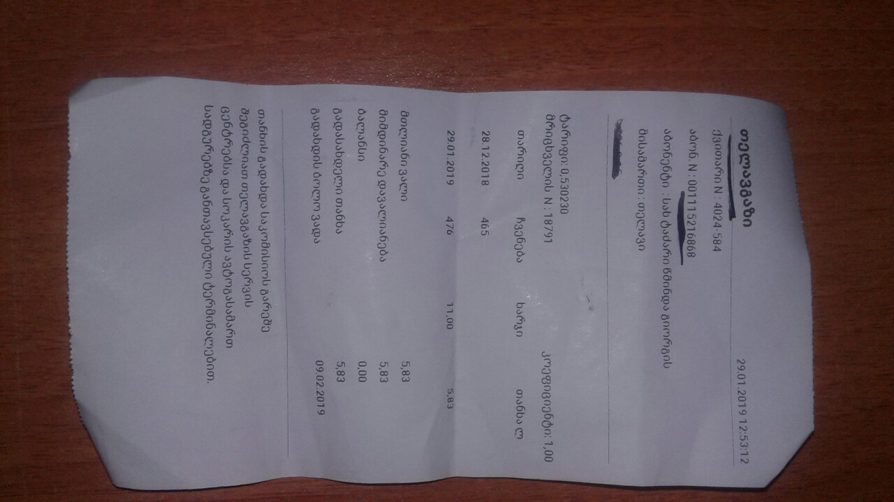 ერთი კითხვა გვაქვს და თუ შეგიძლიათ დაგვეხმაროთ, გვაინტერესებს ქ.თელავში ოპერირება თქვენმა კომპანიამ ხომ არ დაიწყო. გამოგვიგზავნეს ერთერთი ქვითარი (გიგზავნით დანართის სახით) სადაც მითითებულია რომ დავალიანების გადახდა შეუძლიათ სოკარის ავტოგასამართ სადგურზე და ამასთანავე თქვენს მიერ გამოგზავნილ სერვისშიც იძებნება აღნიშნული აბონენტი.