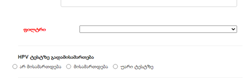 თუ პაციენტის კრიტერიუმები აკმაყოფილებს პირობებს (ჩვენი ფილიალები, ყოველი მეორე, არა FU, ...) გინეკოლოგის უჩნდება დამატებით შემდეგი ველები: