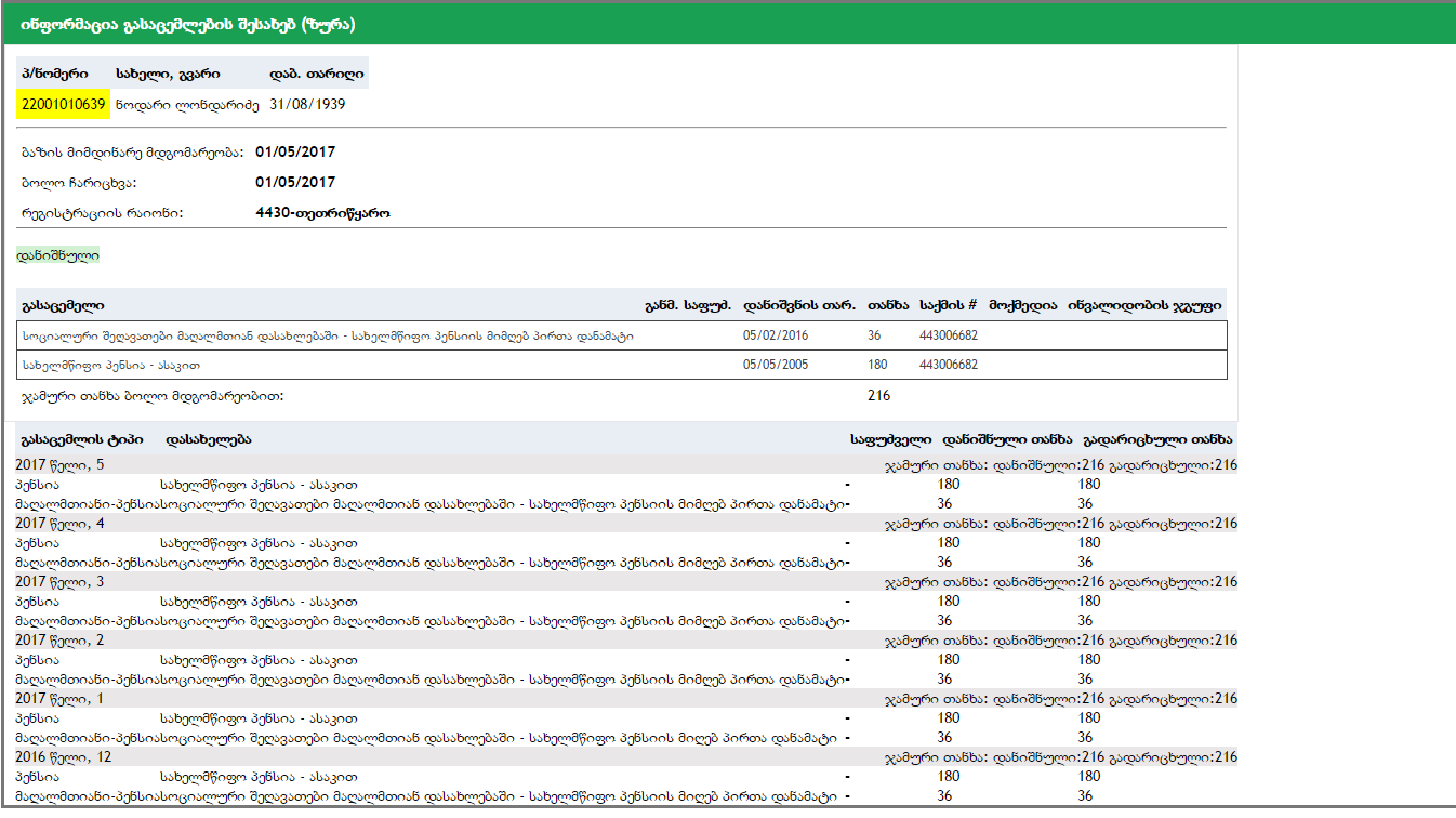 Person, Guardian, დანიშნული გასაცემლები (AssignedPayouts), ბოლო 6 ჩარიცხვა (PaymentsDetails)