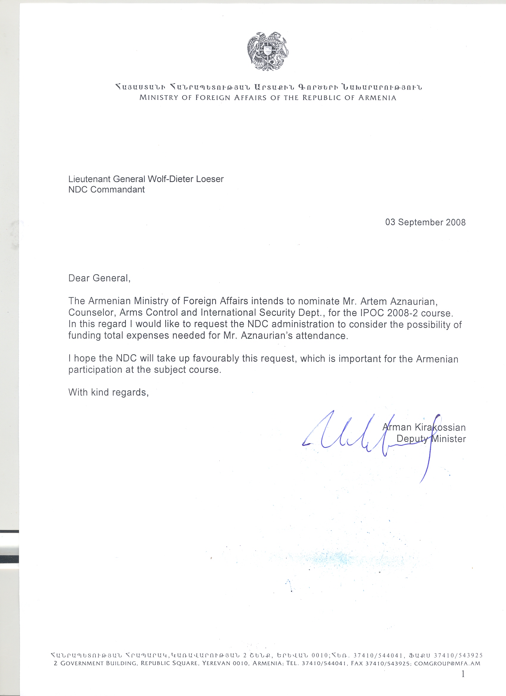 Index of /Biological Weapons/Files from US Embassy in Erevan/Artyom Aznauryan's transfer to study at the NATO Defense College