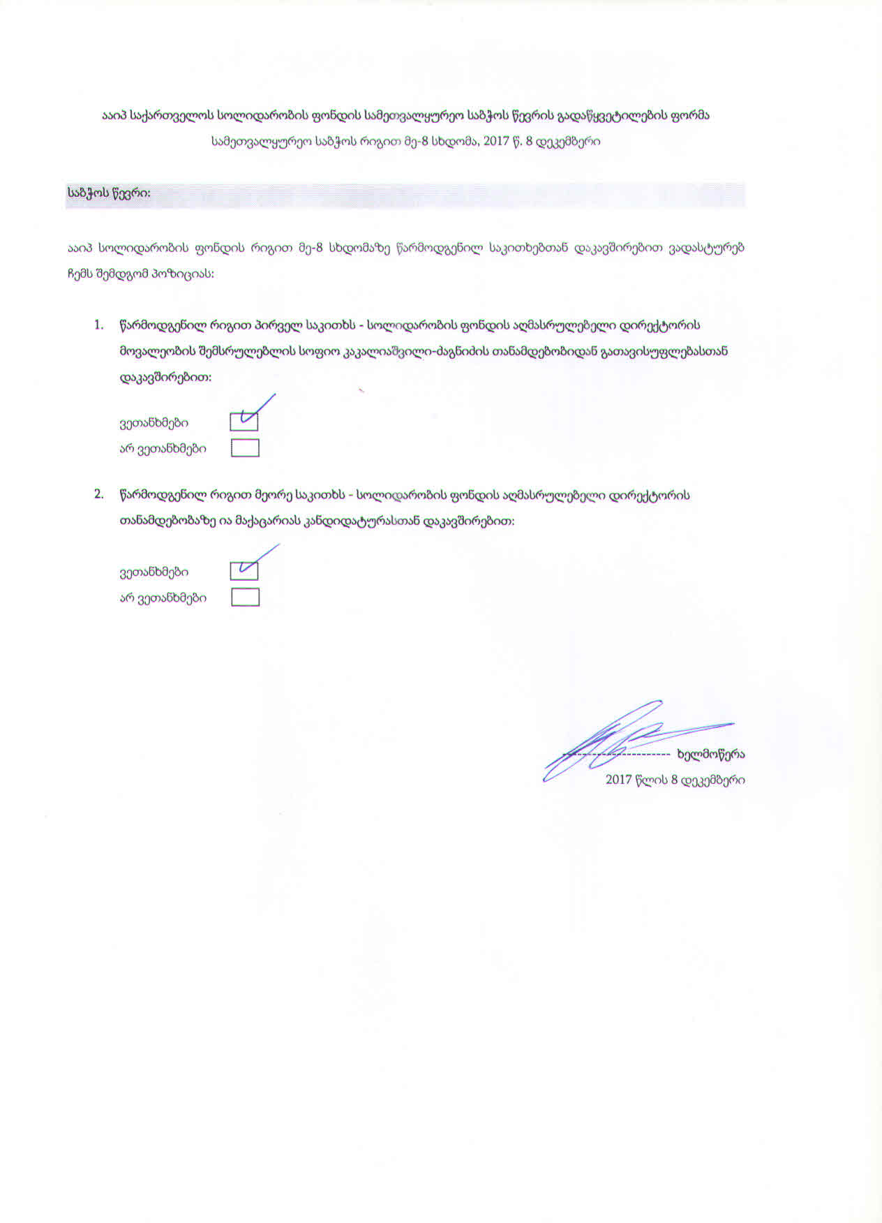 12 დეკემბერს დღის ბოლომდე სამეთვალყურეო საბჭოს 11 წევრიდან ორივე საკითხთან დაკავშირებით დადებითი პოზიცია დააფიქსირეს საბჭოს შემდეგმა წევრებმა: