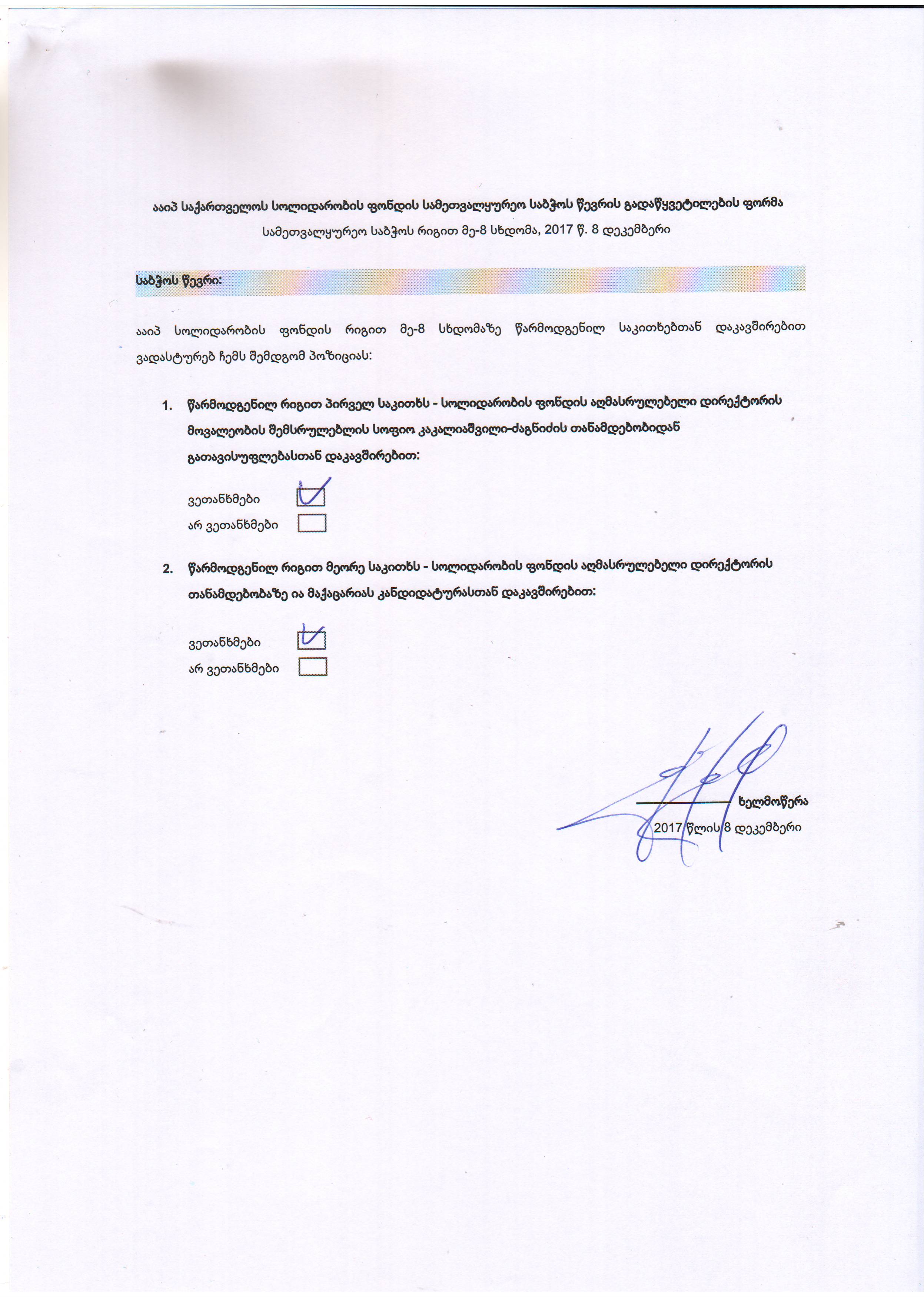2. სოლიდარობის ფონდის აღმასრულებელი დირქტორის თანამდებობაზე ია მაქაცარია-ჩხაიძის დანიშვნის შესახებ.