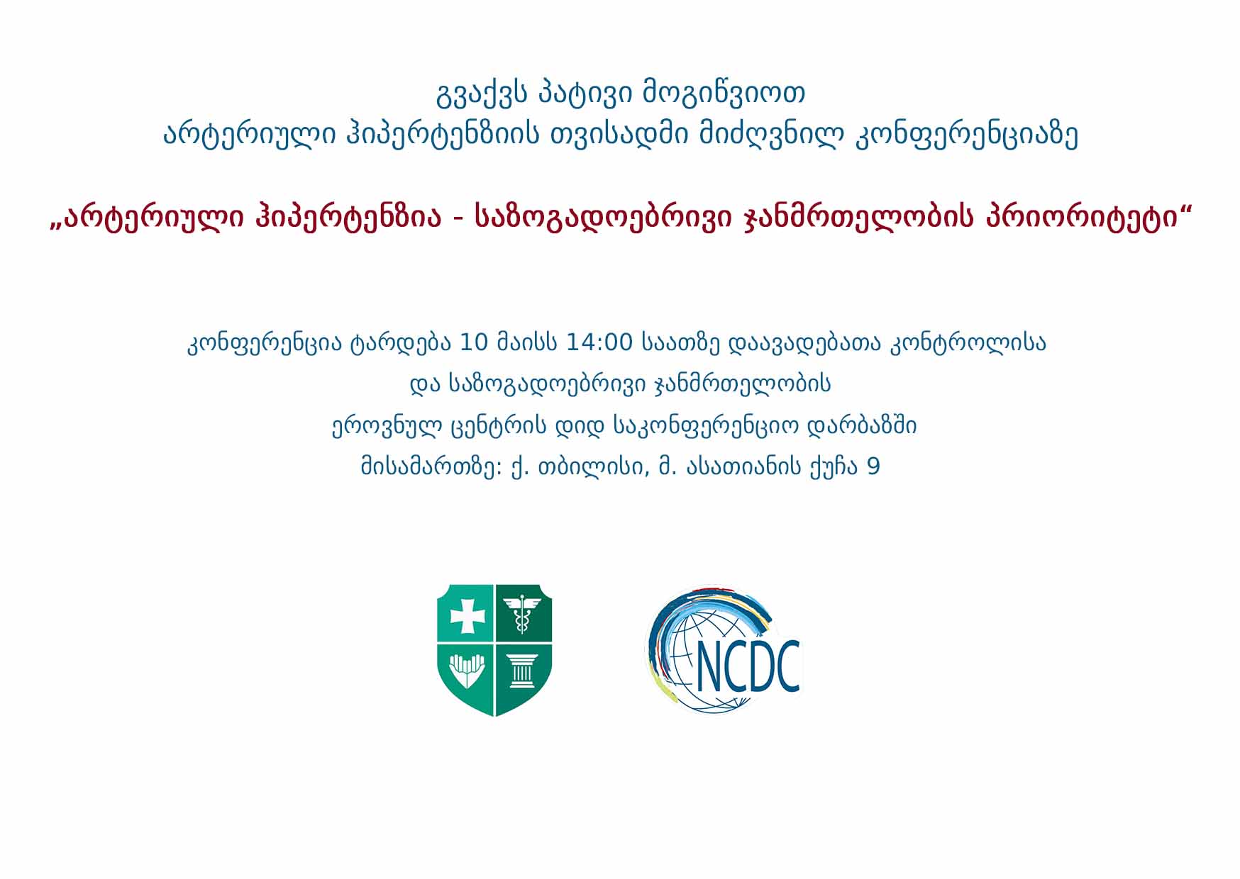 საქართველოს შრომის, ჯანმრთელობისა და სოციალური დაცვის სამინისტროსა და სსიპ ლ. საყვარელიძის სახ. დაავადებათა კონტროლისა და საზოგადოებრივი ჯანმრთელობის ეროვნული ცენტრის სახელით პატივი გვაქვს მოგიწვიოთ არტერიული ჰიპერტენზიის თვისადმი მიძღვნილ კონფერენციაზე არტერიული ჰიპერტენზია - საზოგადოებრივი ჯანმრთელობის პრიორიტეტი, რომელიც ტარდება ა.წ. 10 მაისს, ხუთშაბათს, დღის 2 საათზე დაავადებათა კონტროლისა და საზოგადოებრივი ჯანმრთელობის ეროვნულ ცენტრის დიდ საკონფერენციო დარბაზში (მ. ასათიანის ქუჩა 9).