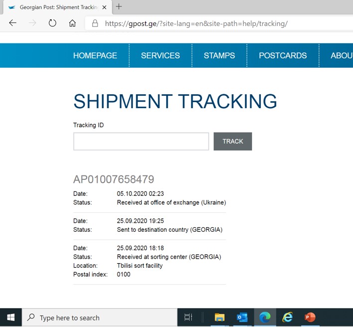 Please see attached tracking information. Would it be possible to contact Georgian post to find out what is going on?