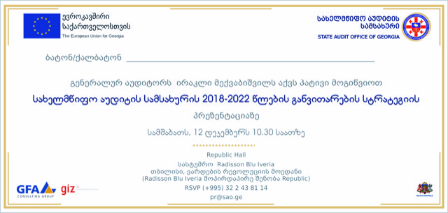 გიგზავნით სახელმწიფო აუდიტის სამსახურის, 2018-2022 წლების განვითარების სტრატეგიის პრეზენტაციაზე, მოსაწვევ ბარათს,  მოწვევის ორიგინალი ვერსია გამოგზავნილია ფოსტით, გთხოვთ დამიდასტუროდ დაესწრება თუ არა ბატონი დავით სერგეენკო,