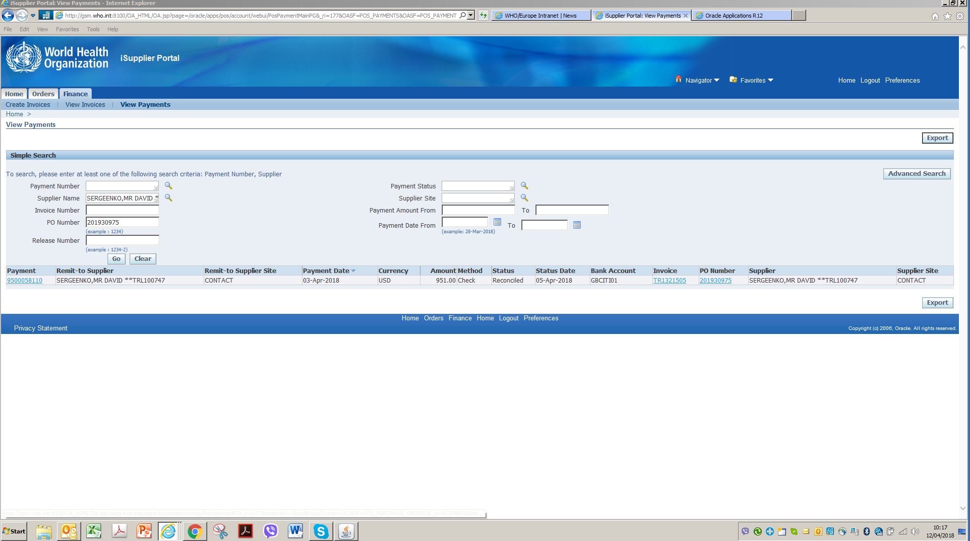 Please see the attached screen shots from WHO system. Payment has been done on 3 April and reconciled with status date 5 April.
