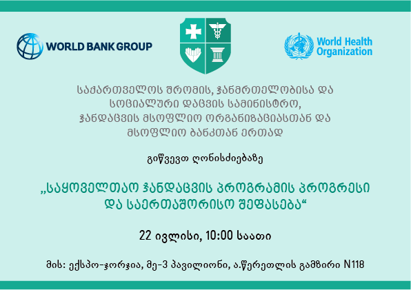 მოგესალმებით, გიწვევთ ღონისძიებაზე "საყოველთაო ჯანდაცვის პროგრამის პროგრესი და საერთაშორისო შეფასება" 11:00 საათზე საგამოფენო ცენტრ "ექსპო-ჯორჯიას" მესამე პავილიონში. პატივისცემით, ნინო ტალახაძე