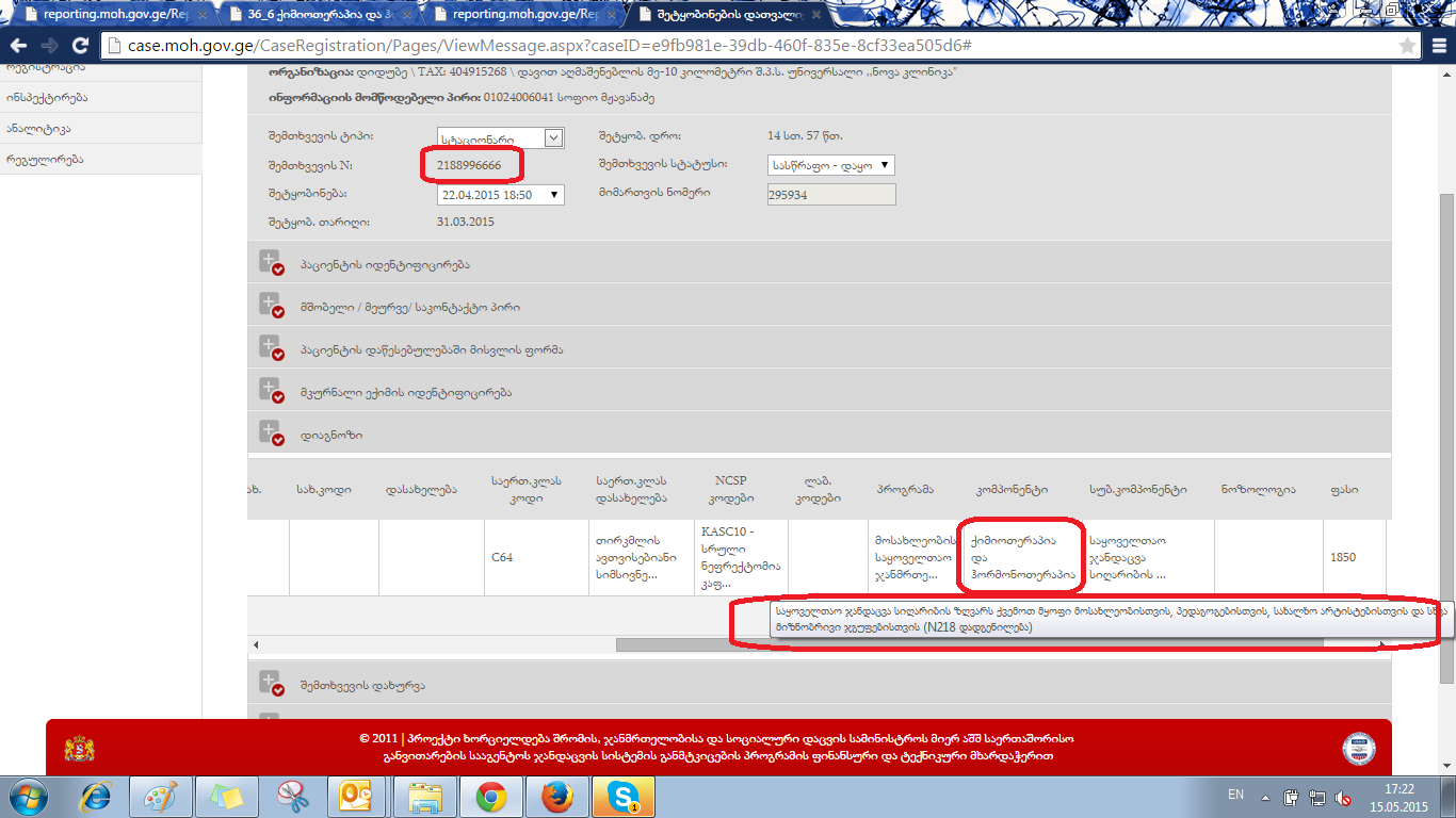 კლინიკამ (ს/კ 404915268 ) შემთხვევა (შ/ნ 2188996666) რეპორტინგში ატვირთა 36 ქიმიო და ჰორმონოთერაპიაში. არის 218 როგორ აიტვირთა ეს შეზღუდვა როგორც ვიცი და გადამოწმებულიც გვაქვს ბევრჯერ ჩადებულია პროგრამაში.