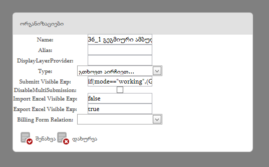 ამ გვერდიდან იცვლება ველების სახელები, გადაგზავნის ღილაკის გაქრობა გამოჩენის პირობები, ცხრილში დამატების ღილაკის გაქრობა გამოჩენის პირობები, ალიასები და სხვა მრავალი...