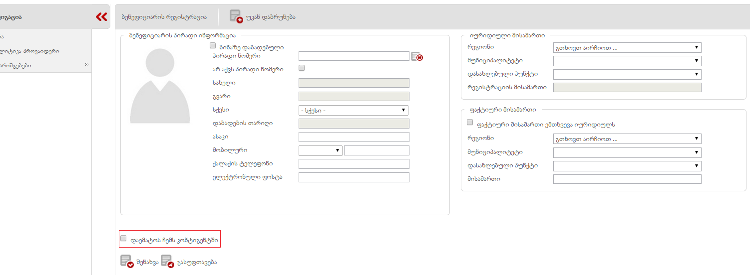 მოსანიშნი პუნქტი „დაემატოს ჩემს კონტინგენტში“, თუ შერეული დაწესებულება მონიშნავს მოანიშნ პუნქტს და შეინახავს , მოხდება ბენეფიციარის