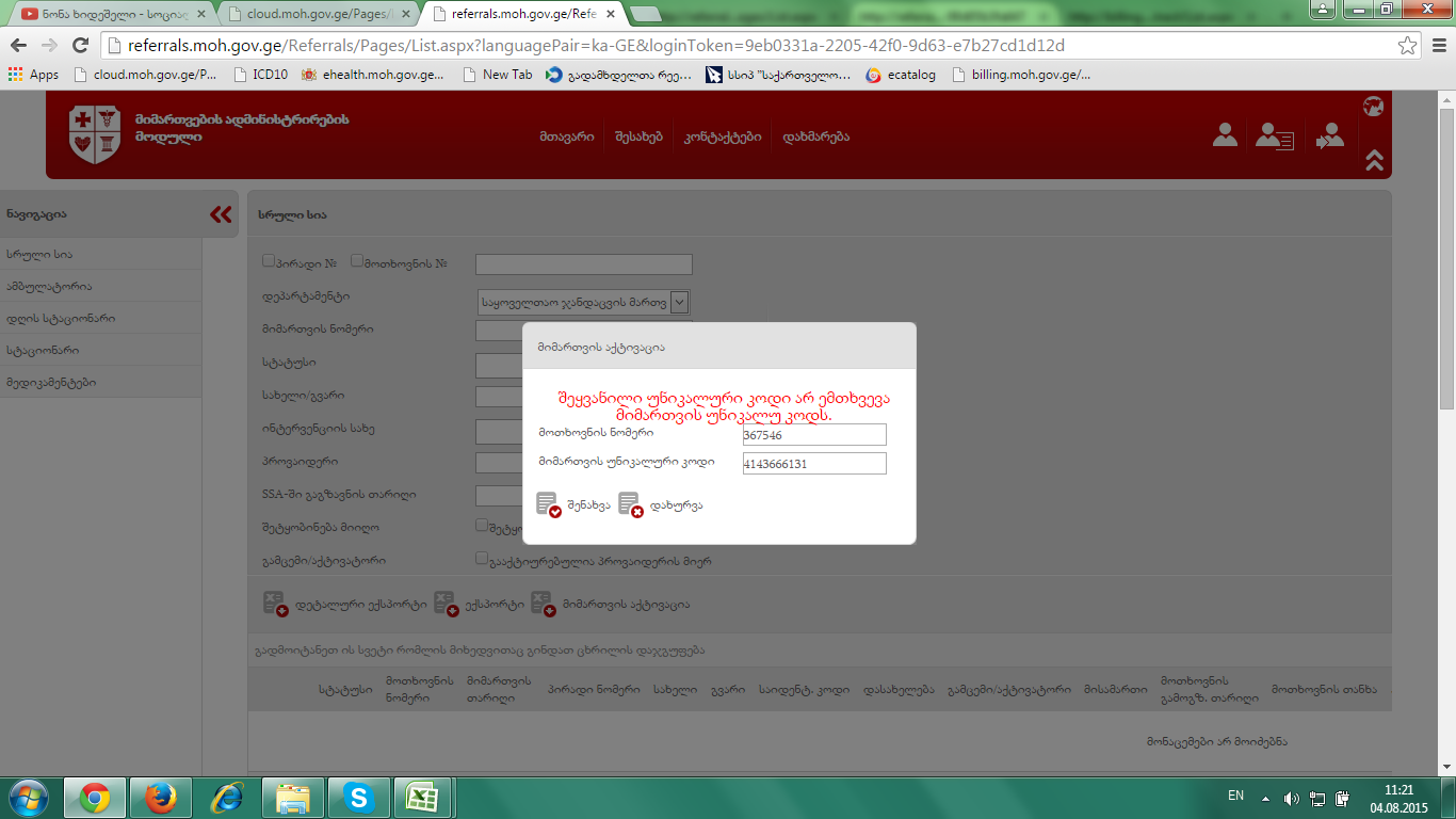 რამდენიმე კლინიკა რეკავს შემდეგი პრობლემით, რომ ვერ ახერხებს მიმართვის გააქტიურებას. ერთ-ერთ კლინიკაზე მე თვითონ გადავამოწმე და გამოაქვს შემდეგი ტიპის შეტყობინება-იხილეთ ბმული. კლინიკა-405001466. გთხოვთ, დახმარებას.