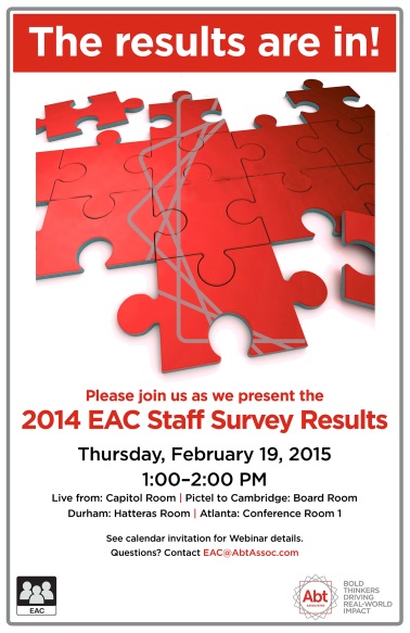 Over the last several months, your EAC has been hard at work reviewing the results of the 2014 staff survey, responding to employee and management requests, and preparing to welcome new representatives. We’re happy to share the following updates with you. As always, if you have any questions please contact us! A New Way to Contact the EAC AnonymouslyThere’s a new way for Abt Associates’ staff to bring their questions, concerns or comments to the EAC anonymously. Click here to submit anonymous feedback to the EAC. A link to this platform appears on the EAC’s AGI page under “Submit a Question/Concern”. In addition to submitting anonymous feedback, you can always e-mail the EAC or discuss your concerns with any representative. The Results are in!