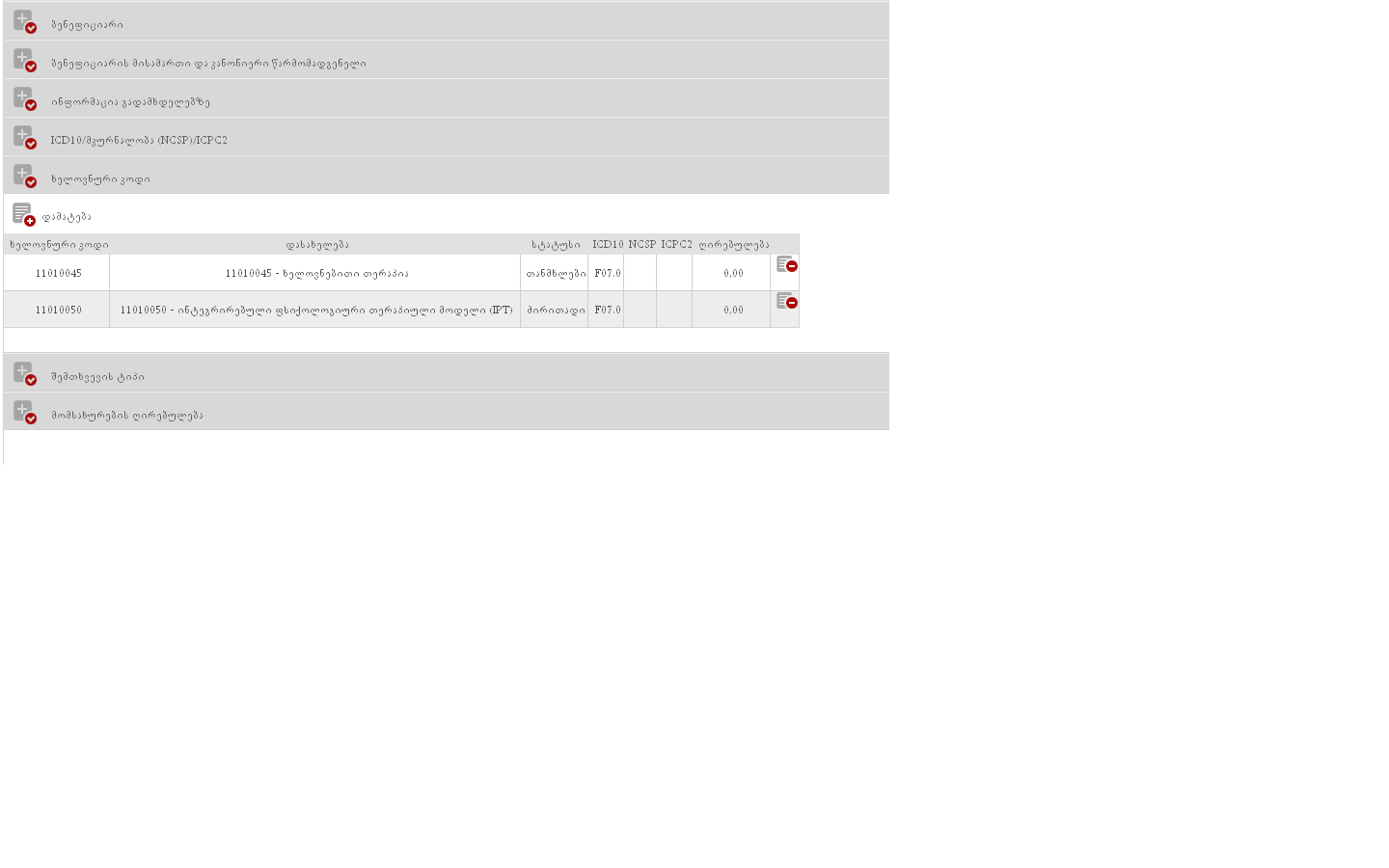 ამავე შესრულებაში ყველა ჩანაწერზე ცარიელია ,,ნოზოლოგიის კოდის“ ველი, დათვალიერების ინტერფეისით გადავამოწმეთ და აღნიშნული ველი შევსებულია.