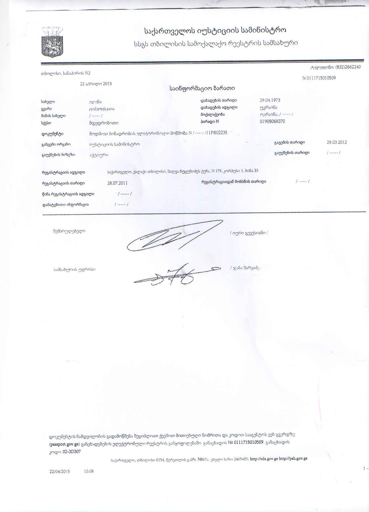 გამარჯობათდღეს გირეკავდითმოდულში არ არ ირტვირთება პაცინეტები რომლებსაც აქვს დროებითი ბინადრობით ჩაწერაესენია:1, გერეხელია ნინელი - 620140059632, გრომოვა-ჩიხლაძე ლიუდმილა - 013011273643, შეყილაძე დავითი - 010130109764, გრიშინა მარინა - 017910025235, ციპკოვსკაია ელენე- 01908068370გიგზავნით ციპკოვსკაია იუსტიიციდან ამონაწერს იმის შესახებ რომ ის ნამდვილად არის მუდმივ ბიანდრობაში ჩვენს ქვეყანაში