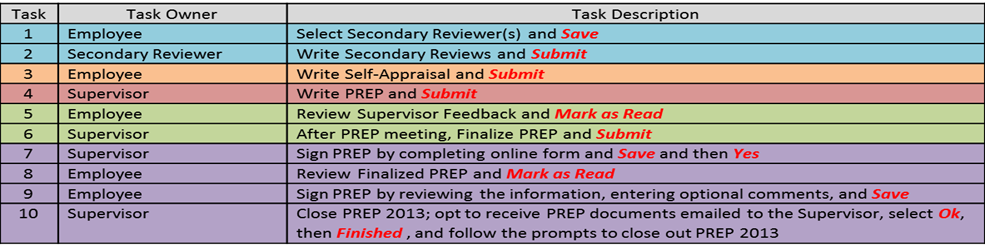 The PREP 2013 Workflow has been streamlined to be more efficient. Specific PREP 2013 tasks along with the person responsible for each task and the action(s) required are included in the table below: