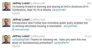Jeffrey Lubell is Director of Housing Initiatives at Abt Associates and a nationally recognized authority in housing and community development. In addition to writing several blogs including, “The Home Front,” Lubell is active on Twitter. On his account, @JeffreyLubell, he tweets about his research as well as housing policies and programs in the U.S.. Check it out! Let’s Connect Social Media offers many options for staying apprised of – and engaged in – news and activities at Abt Associates. If you have any questions about how to participate, we’re here to help. Please contact us at Corporate_Communications@AbtAssoc.com . | ||||||||||||||||||||||||||||||||||||||||||