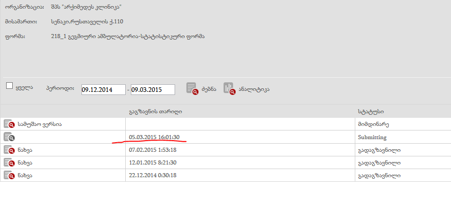 შევედი ქვემოთ მოწერილი საიდენტიფიკაციო ნომრით დაწესებულებაში და ვნახე , რომ გადაგზავნილი სტატისტიკურო ფორმა გადაგზავნის პროცესშია
