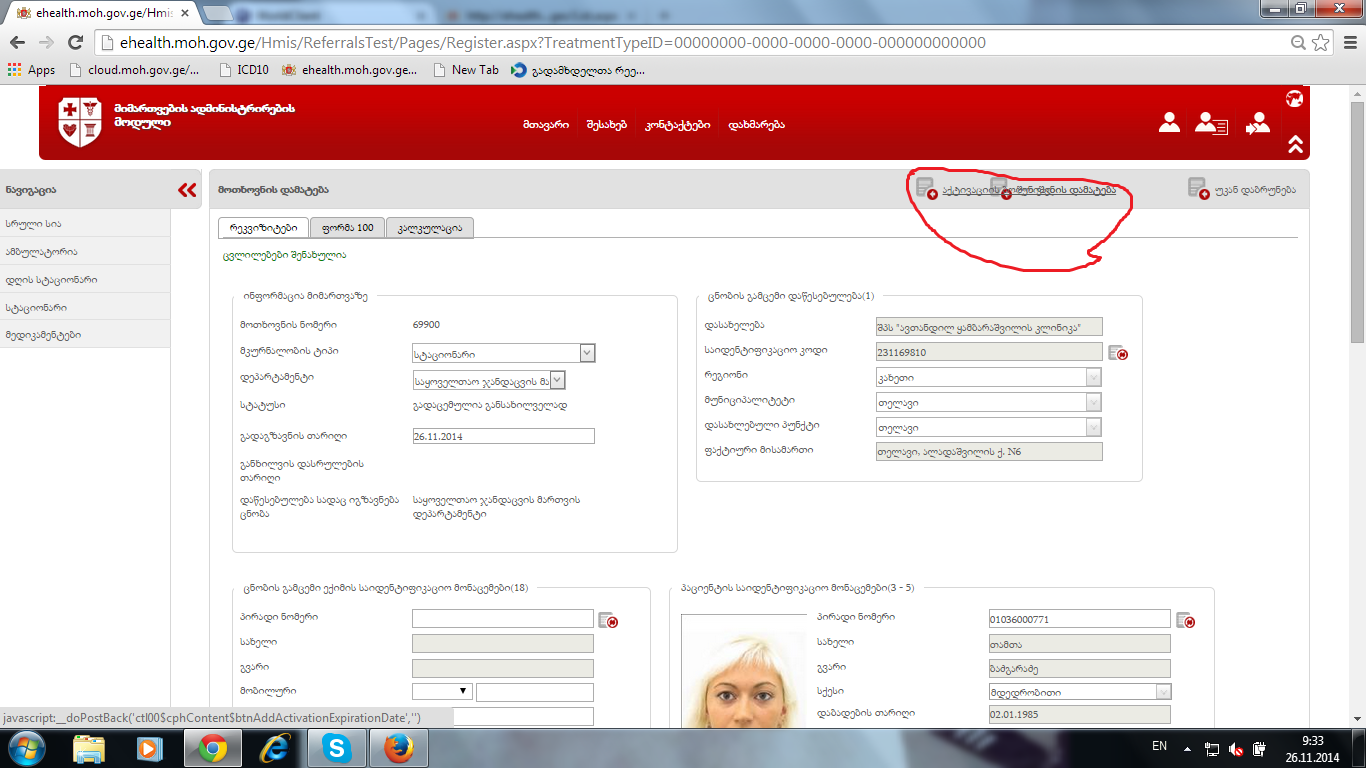 მიმართვის აქტივაციის ღილაკი ყველა ჩანს ნაწილობრივ რეკვიზიტების, ფორმა100-ის და კალკულაციის გევრდზეც. ბმული.