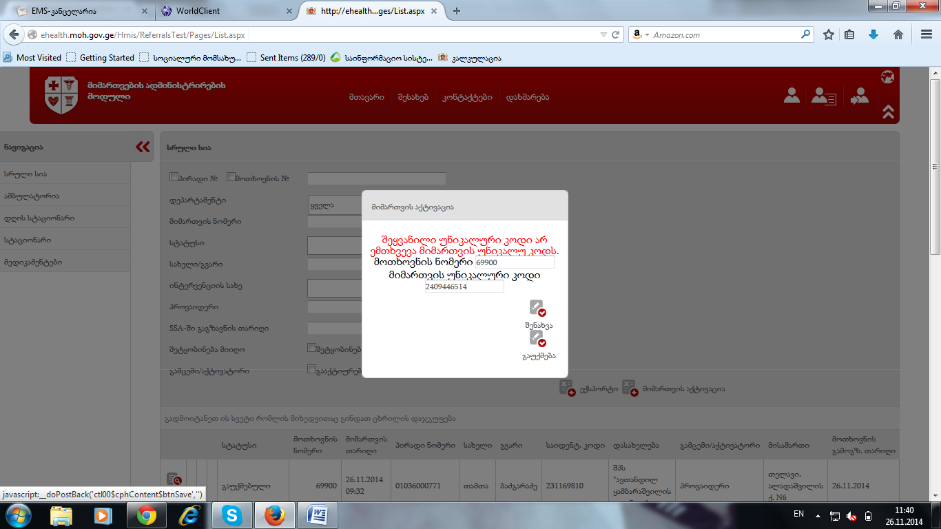გაუქმებულ მიმართვაზე შევქმენი დუბლიკატი დავამტკიცე და კლინიკის მხრიდან შემყავს კოდი და წერს რომ  კოდი არ ემთხვევა. ბმული. Sms მაქვს შენახული თუ რამე...(ეს შემთხვევა მეორეჯერ გავტესტე სხვა მოთხოვნით და იგივე პრობლემაა)