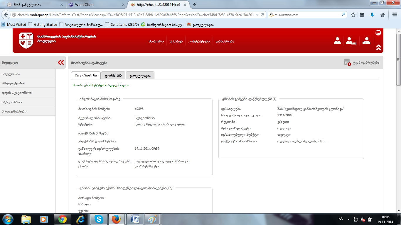 მიმართვას რომელზეც ვერ შედის კლინიკა (სქრინშოტი) აქვს სტატუსი გაცემული.