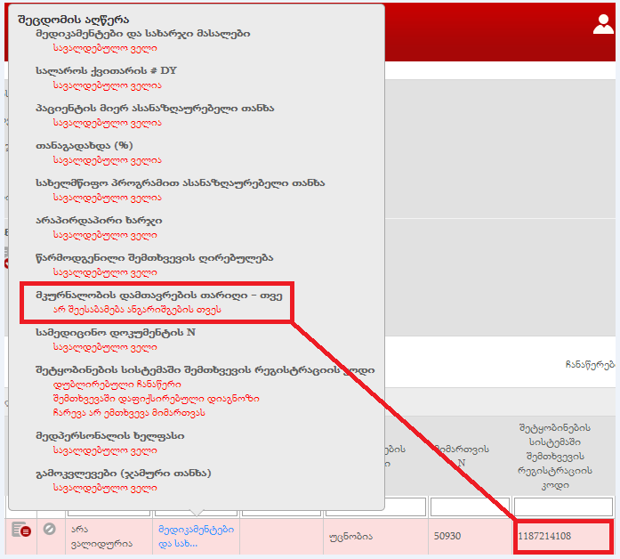 ბაიკო, გიგზავნით ერთ-ერთი შემთხვევის ნომერს რომელზეც პროგრამა არ აკომენტარებს პრობლემებს შესაბამის, დაწესებულების საიდენტ.N412672424, გეგმიური ქირურგია 36-4, შემთხვევის N1187214108. ზემოთ აღნიშნული შემთხვევა არის სექტემბრის თვის (ცდება ანგარიშგების თვეს) და დიაგნოზი დამატებულია დახურვის შემდეგ, პროგრამა აკომენტარებს მხოლოდ "პროგრამაში დაფიქსირებული დიაგნოზი ჩარევა არ ემთხვევა მიმართვას "