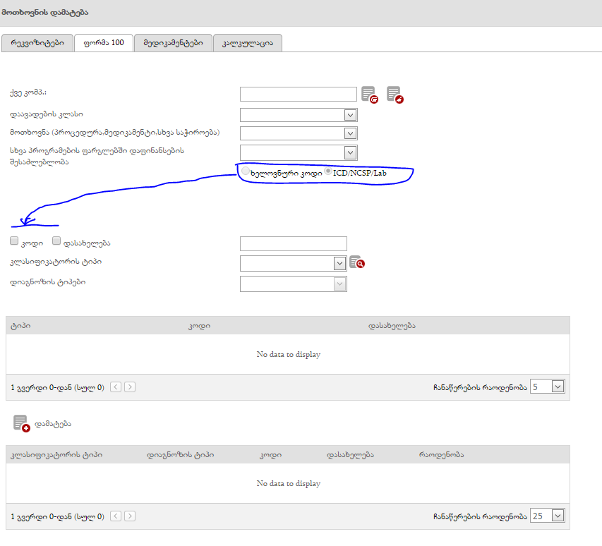 2. ფორმა 100-ში ICD, NCSP -ის დამატების პოპ აპში სხვა პროგრამების ფარგლებში დაფინანსების შესაძლებლობა გახდეს დროფ დაუნი: საყოველთაო, ვერტიკალები და სხვა