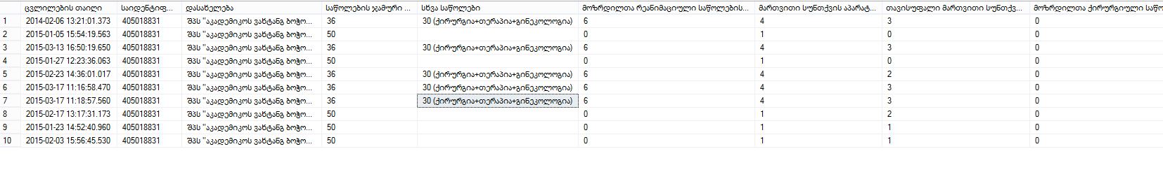 შეთანხმებისამებრ გიგზავნით ბაზიდან ამოღებული მონაცემების სურათებს შესაბამისი ველებით. თანდართული ფაილის სახით იხილავთ ერთ და იგივე ინფორმაციას ორ ვერსიად: მხოლოდ ცხრილი - სურათი 1 და იგივე ინფორმაცია შესაბამისი პროგრამული კოდით სურათი 2.