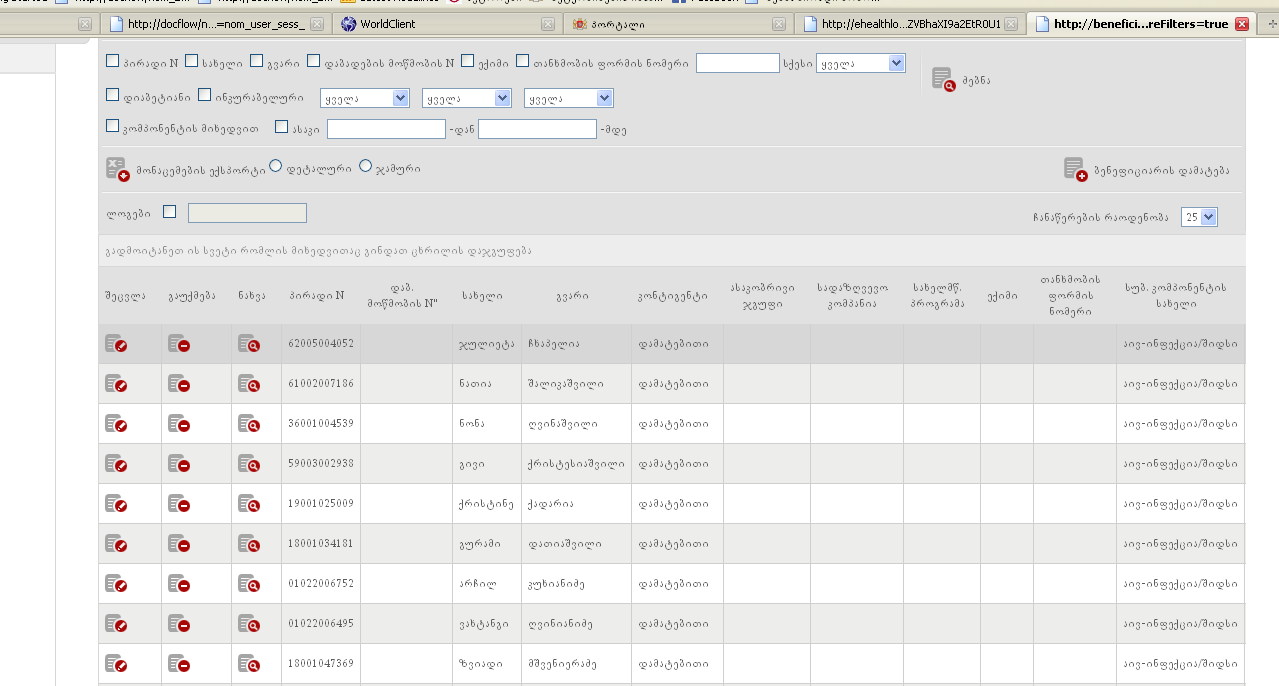 ბენეფიციარების რეგისტრაციის მოდულში, აივ-ინფექცია/შიდსის კომპონენტში დაფიქსირებულია სულ 1649 ბენეფიციარი, აქედან 1593 ბენეფიციარს აქვს ,,დამატებითი" კონტიგენტის სტატუსი. სააგენტოს დავალებით მომხმარებლის მიერ გაპასიურებულია ის ბენეფიციარები (