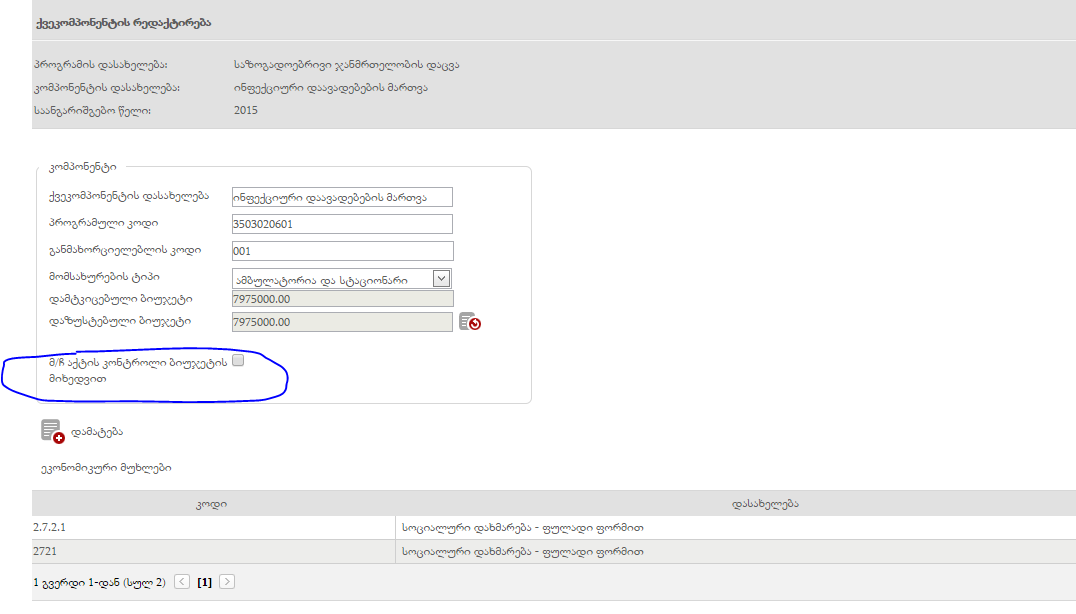 მოცემული ვალიდაცია ჩადებულია ფინანსურ მოდულში. ასამუშავებლად საჭიროა, რომ შესაბამის ქვეკომპონენტზე მონიშნოთ „მ/ჩ აქტის კონტროლი ბიუჯეტის მიხედვით“.