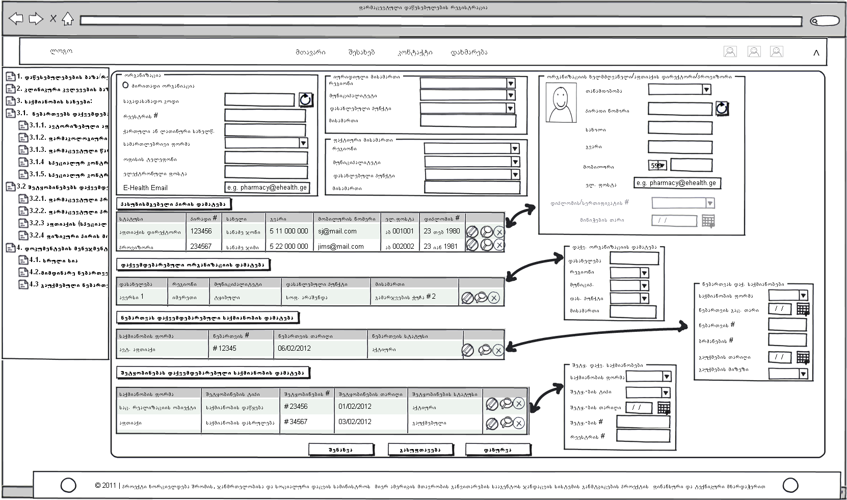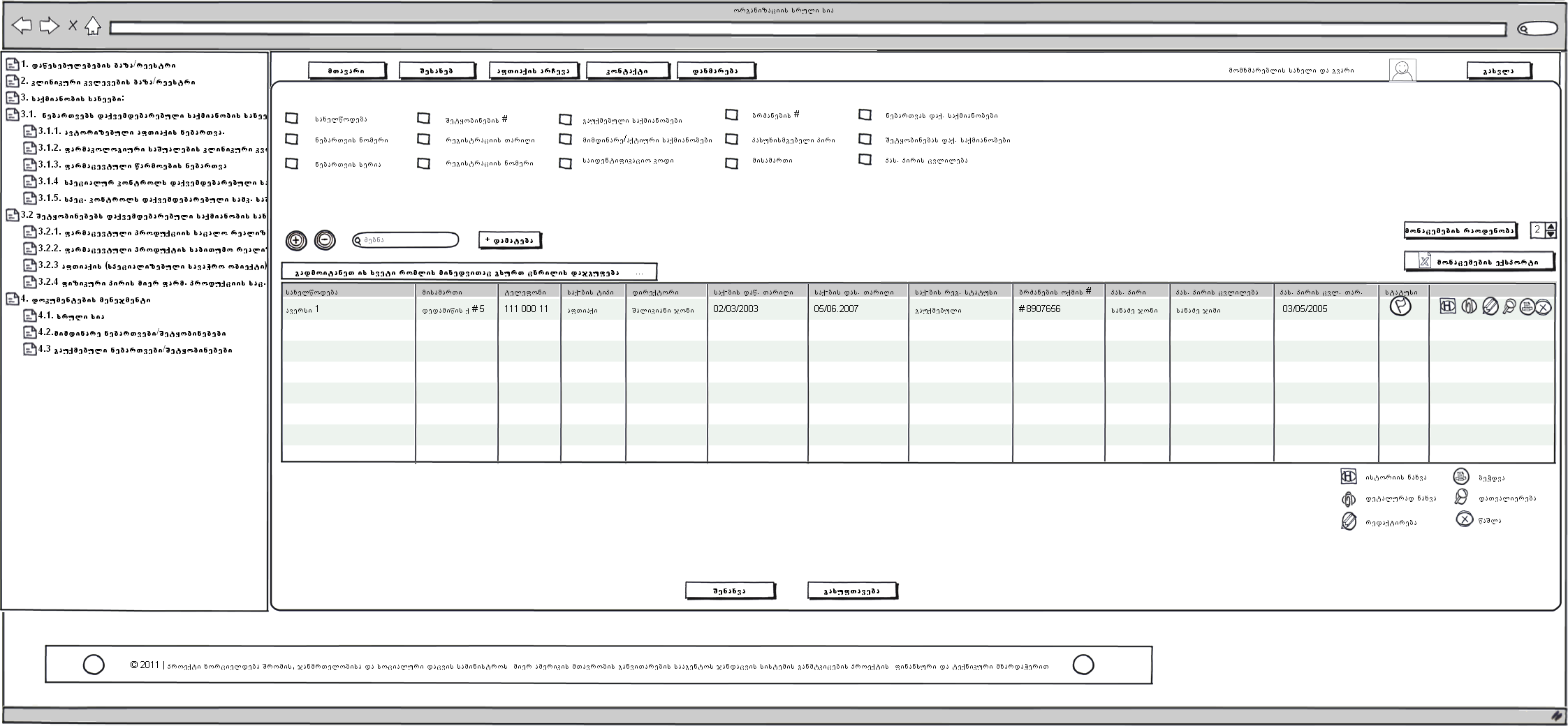 ამჯერად გიგზავნით ბაზის მონახაზს, რომელშიც შეტანილია ცვლილებები ჩვენი ბოლო განხილვის შესაბამისად. დოკუმენტებში მოცემულია ფარმაცევტული დაწესებულების რეგისტრაციის (დირექტორის/პასუხისმგებელი პირის ჩათვლით) და დაწესებულების ჩამონათვალის მონახაზი (ფილტრაციის ველების ჩათვლით).