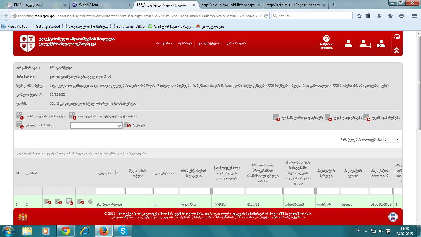 http://reporting.moh.gov.ge/Reporting/Pages/Data/ViewSubmittedFormData.aspx?KeyID=c37371b9-7b62-46d1-aba6-959db28594e9&FormID=28932a45-ea20-4fec-8783-619e00bef842&ContractID=89ad2956-401d-4734-9f5b-c88d8c3a5d74&ProviderID=70ff295b-df28-4b41-a0d5-00a35e4b4762&languagePair=ka-GE&loginToken=e0431d8c-b379-4359-843b-5cb18f4e4156