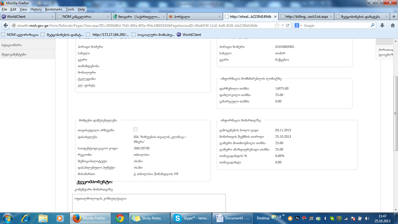 გიგზავნით თქვენს მიერ მოთხოვნილ ინფორმაციას, მიმართვის დარეგისტრირების გვერდზე არსებული tab-ების მიხედვით ( ფაილი "მიმართვებში ლოგიკები 25.10.2013"). მემგონი ყველა შეკითხვა ამოვწურეთ (ყოველ შემთხვევაში ძალიან ვეცადეთ).