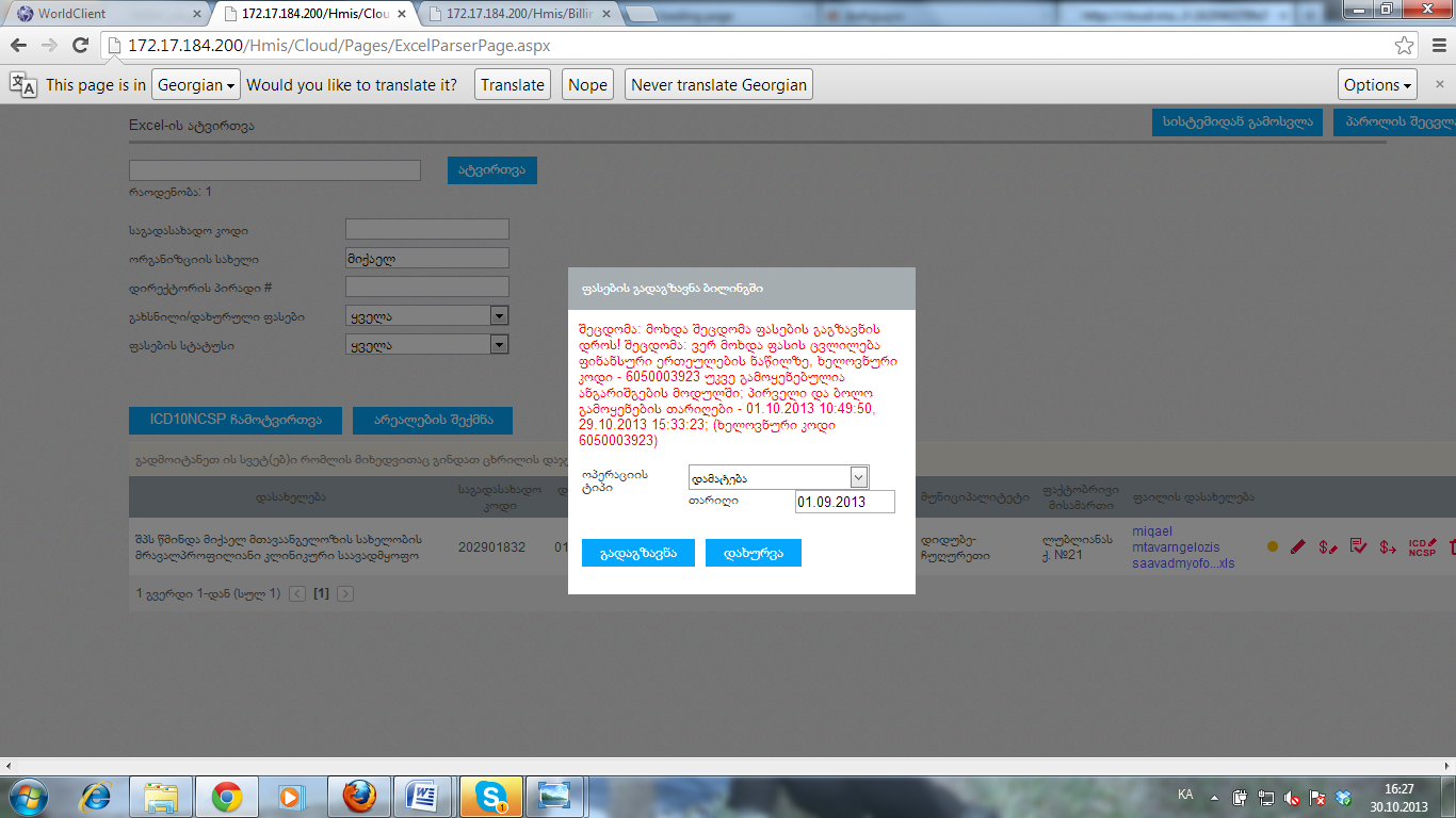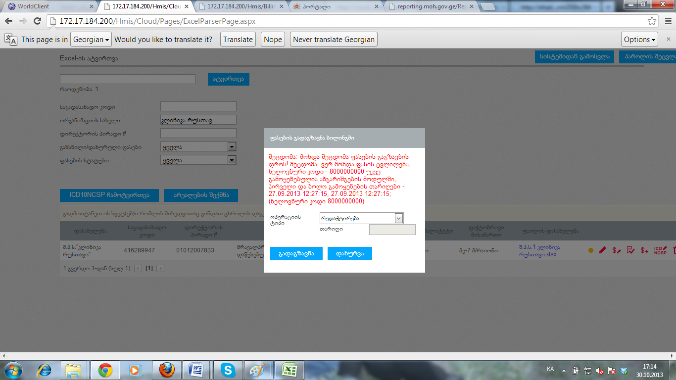 3.       და კლინიკა რუსთავი რომელზეც უკვე მრავალჯერ მოვიწერე. შეცდომა : მოხდა შეცდომა ფასების გაგზავნის დროს ! შეცდომა : ვერ მოხდა ფასის ცვლილება , ხელოვნური კოდი - 8000000000 უკვე გამოყენებულია ანგარიშგების მოდულში ; პირველი და ბოლო გამოყენების თარიღები - 27.09.2013 12:27:15, 27.09.2013 12:27:15; ( ხელოვნური კოდი 8000000000)- ეს კოდი განფასების გარეშე ჰქონდათ წამოღებული ანგარიშგებაში,მანჩო დაგვეხმარა და წაგვიშალა შემთხვევა სადაც ეს კოდი ფიქსირდებოდა,მიუხედავად ამისა იგივე ერორია.