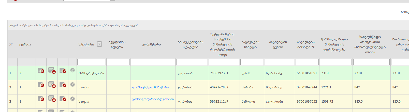 ჩვენი თანამშრომელი შესრულების (შესრულების # 2249680757) დამუშავებისას ცდილობს შემთხვევას (მაგ: შ/ნ 2435792351) შეუცვალოს სტატუსი. სტატუსს რომ ცვლის და აკეთებს შენახვას პროგრამა ტრიალებს არ ანახვინებს სტატუსს. თუ შეიძლება რომ ნახოთ აღნიშნული ხარვეზი.