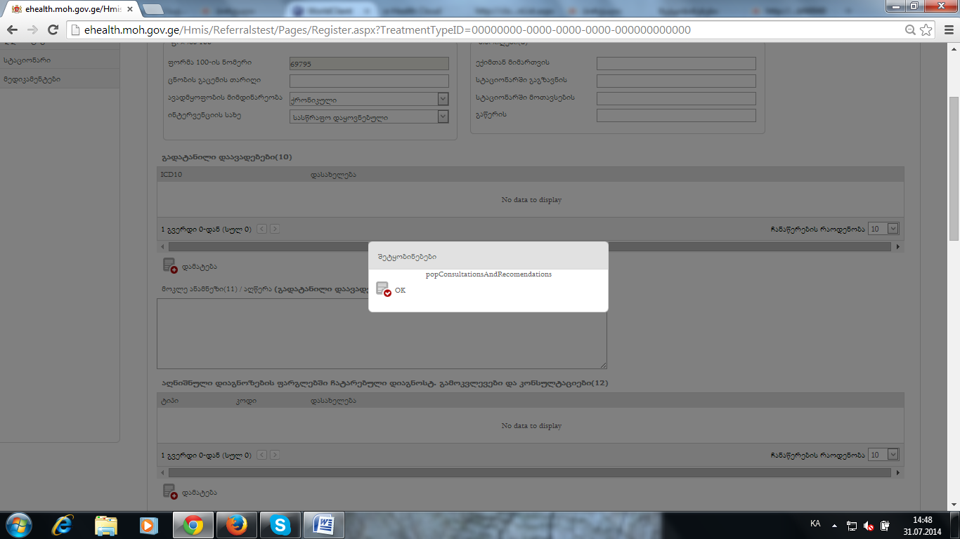 ანუ შევავსე რეკვიზიტების გვერდი და გადავედი ფორმა100-ზე, დაიგნოზების და ჩარევების დამატების დროს შევამჩნიე რომ არ ემატებოდა, ჩავხურე ფანჯარა და გამოვიდა მესიჯი-იხილეთ ბმული 1, შემდეგ ისევ თავიდან ვცადე მაგრამ საერთოდ არ იმატებს- ბმული 2.