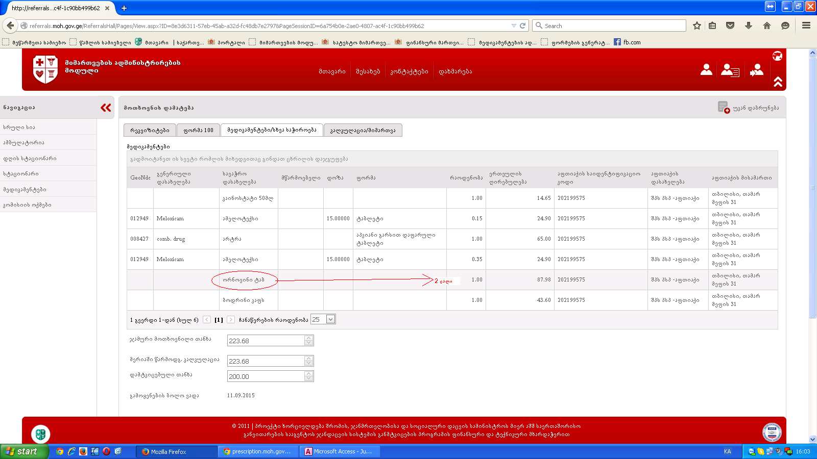 2. მოთხოვნა N 326726. პირადი ნომერი: 01453012659, (ლიზი ეზაკელი) როგორც სქრინზე medikamenti2 ჩანს მედიკამენტებს დოზები აქვს გასაწერი სქრინის მიხედვით გთხოვთ გაგვიწეროთ.